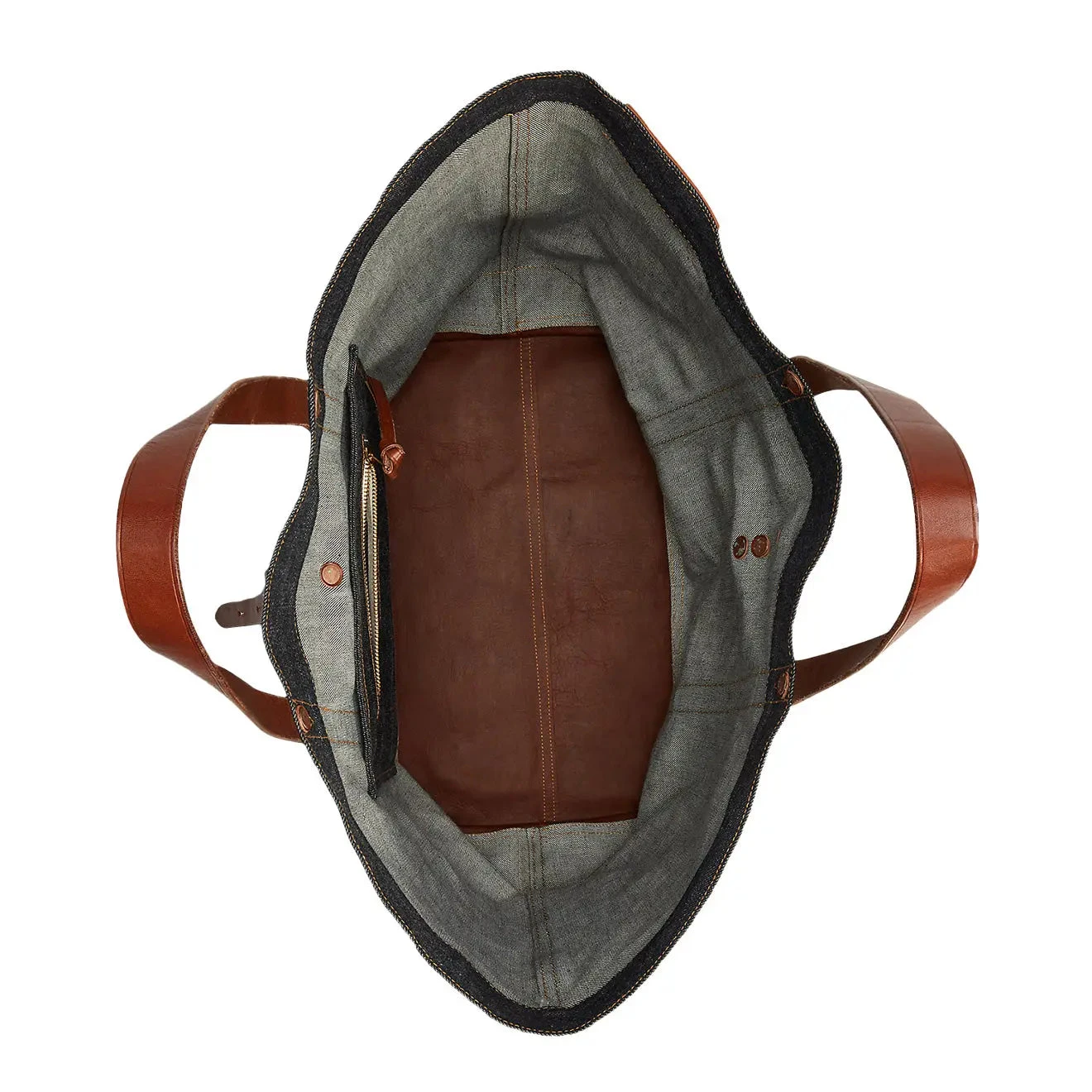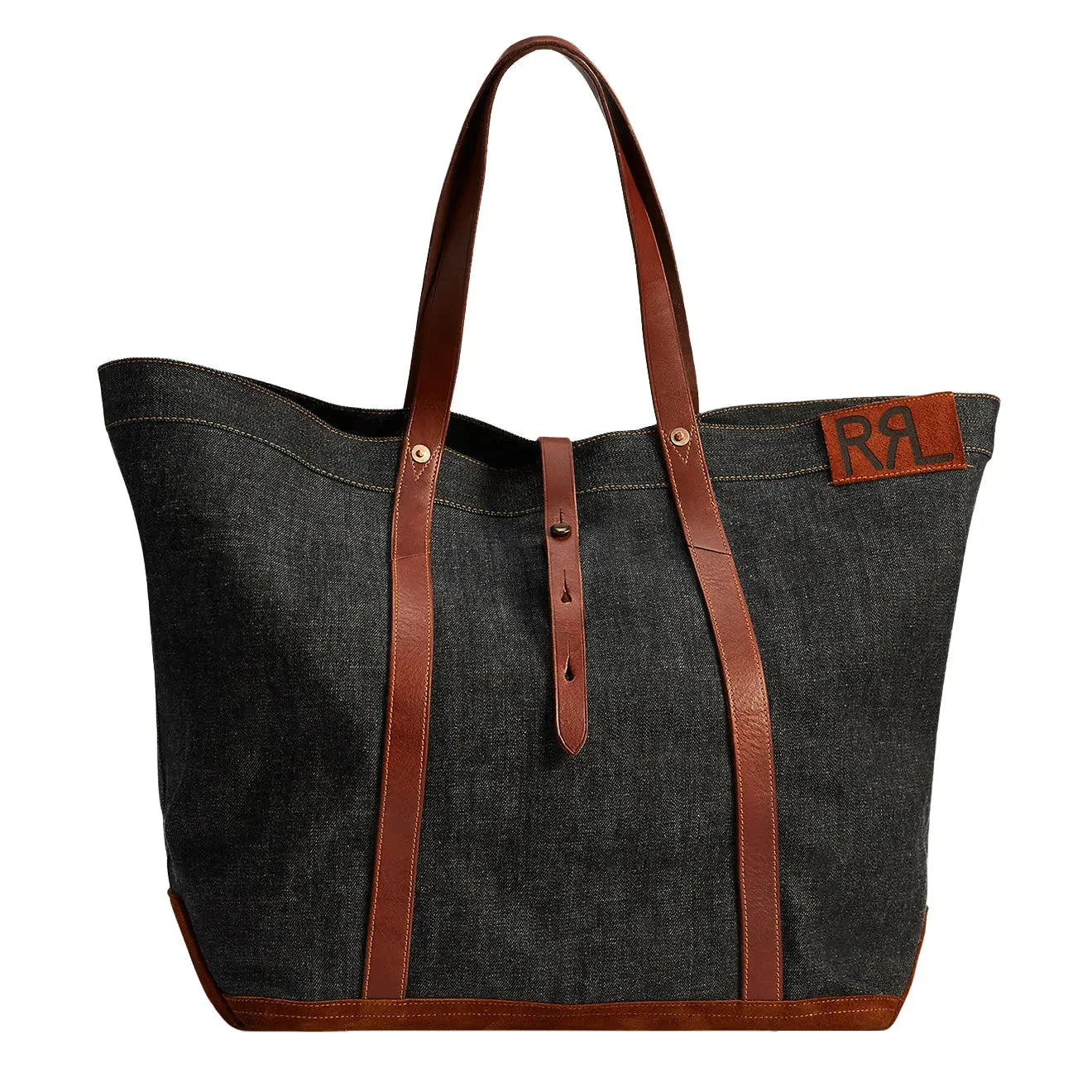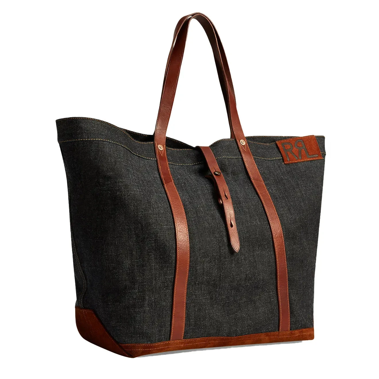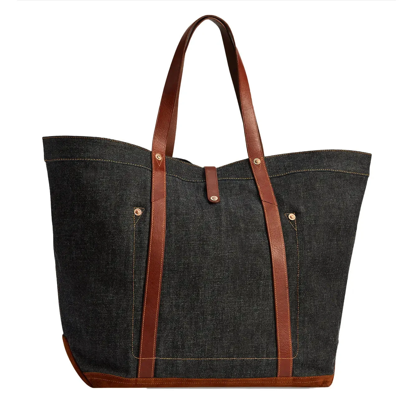 Crafted from Japanese cotton-denim that is dyed with true indigo, the Howard Tote has two vegetable-tanned Italian leather top handles. Roughout suede base and finished with a logo patch and hand-hammered copper-tone rivets. A fold-over leather strap at the front secures with a stud closure.
