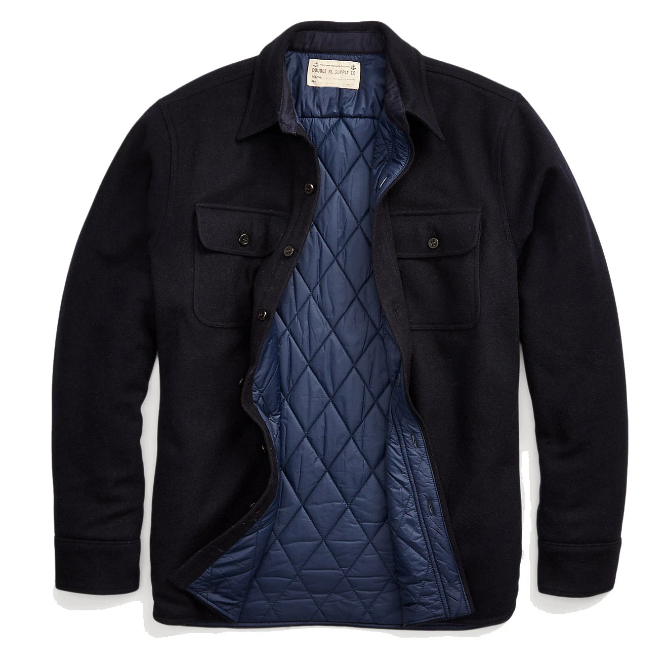 The RRL by Ralph Lauren Quilted Wool Melton Overshirt made from wool melton. Diamond-quilted lining. Inspired by ’40s surplus garments. Two chest pockets and side on-seam pockets. Anchor-etched corozo buttons.