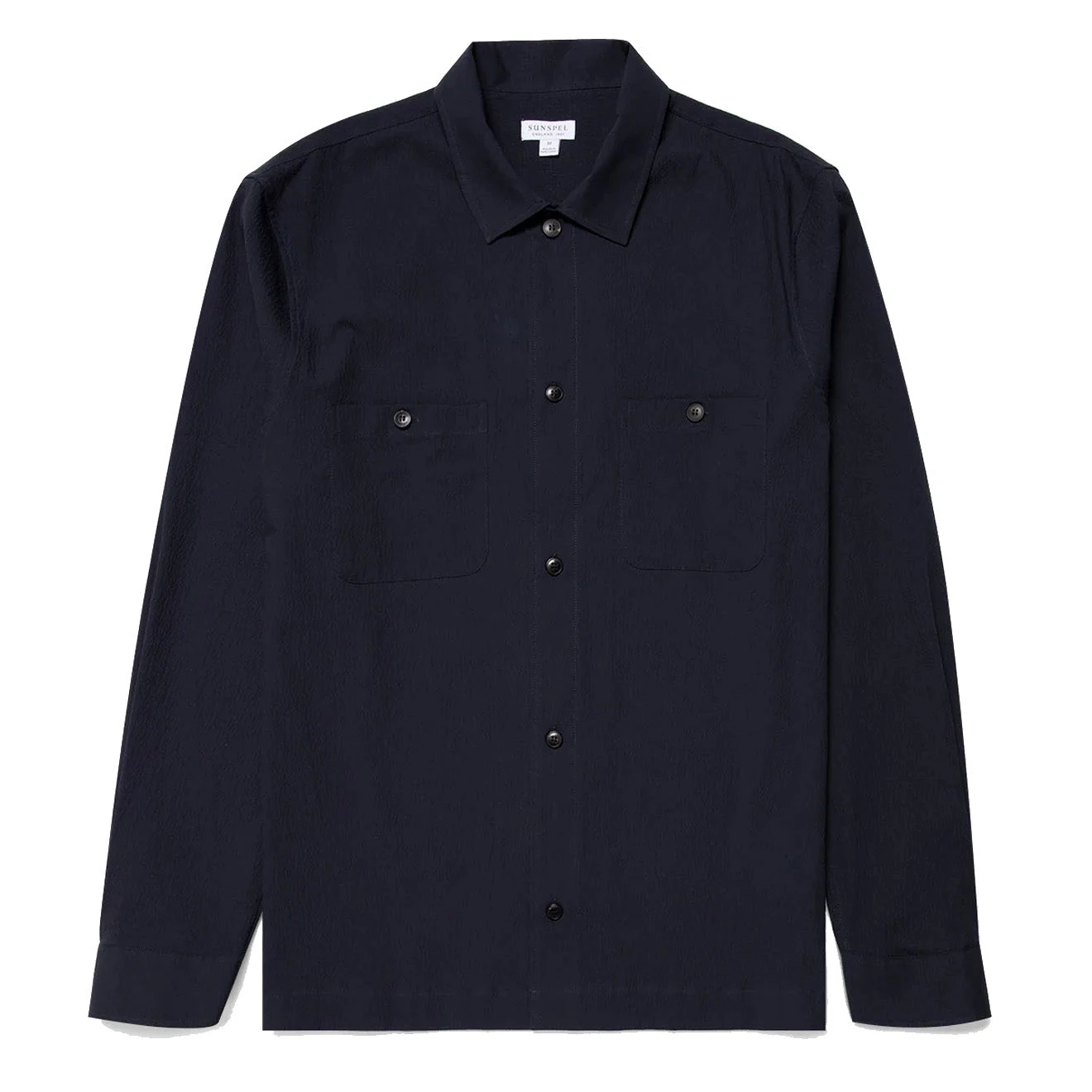 This Sunspel Seersucker Overshirt, is a relaxed fit overshirt with a smooth feel and a slight stretch finish making this a durable and comfortable garment.Â