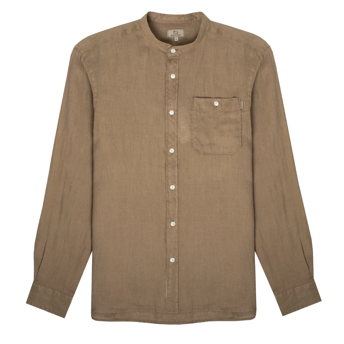 The Woolrich Band Collar Linen Shirt is long sleeved, has a mandarin collar, buttoned fastening, buttoned cuffs, breast pocket, and features the Woolrich logo on the outer section of the left breast pocket.